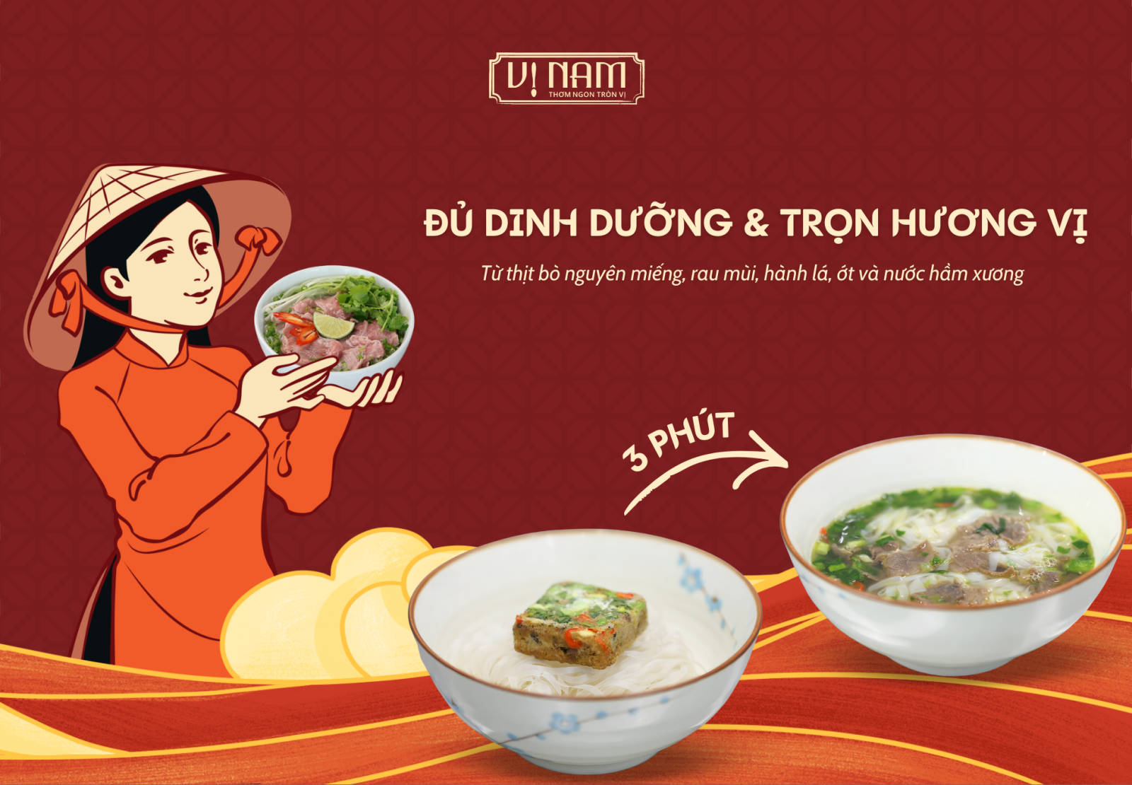 Ba phút đôi khi chỉ đủ để lướt qua một bản tin hay trả lời vài dòng tin nhắn. Nhưng với phở bò Vị Nam, ba phút lại đủ để một bát phở tròn vị hiện diện trên bàn ăn. Chỉ cần chế nước sôi, đậy nắp và chờ đợi từng sợi phở dần bung nở, lát thịt bò mềm thơm, hành lá, rau mùi trở lại dáng hình ban đầu, hương quế hồi thoảng nhẹ trong làn khói ấm. Không cần ninh xương nhiều giờ, không cần chuẩn bị cầu kỳ, người thưởng thức vẫn có thể chạm đến vị ngọt thanh của nước dùng và sự hài hòa quen thuộc của phở Hà Nội.